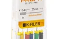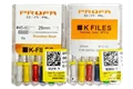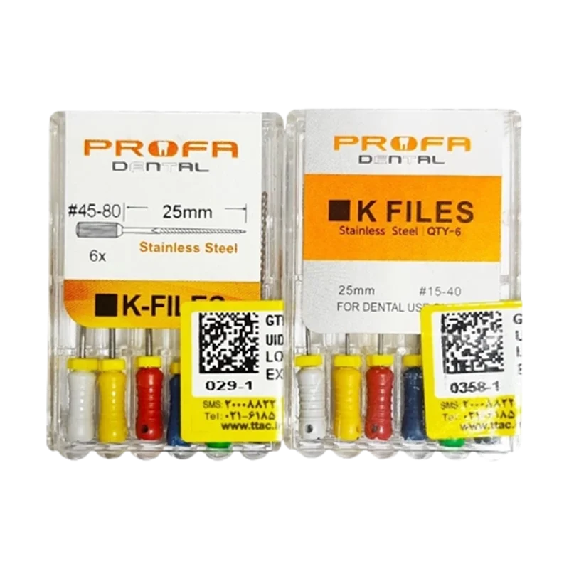 کا فایل پروفا k file PROFA ابزاری برای تمیز کردن و شکلدهی سیستمهای کانال ریشه است که از جنس استیل ضدزنگ یا نیکل و کروم ساخته می شود. این ابزار به عنوان پرکاربردترین فایل دستی برای عصب کشی دندان به شمار می رود. سطح مقطع کافایل ها به صورت متقارن مربعی و مثلثی شکل بوده و بیشترین استفاده آن، در بررسی و رد کردن قسمتهای سخت در کانال ریشه است.دندانپزشک در ابتدا سوراخ کوچکی در دندان ایجاد میکند تا از این راه بتواند به کانال ریشه دسترسی پیدا کند؛ سپس k فایل را وارد میکند و به آرامی میچرخاند تا دندانها تمیز و عاری از هرگونه آلودگی شود. در مرحله بعد، با همین ابزار به دیوارهها شکل میدهد تا آنها را برای پر کردن آماده کند.کا فایل پروفا دارای مقاومت بالا هستند و با دارا بودن دسته ارگونومی، کار را برای پزشک راحتتر می کنند. این محصول معمولا در سایزهای متنوع و رنگبندیهای مختلف عرضه میشود.