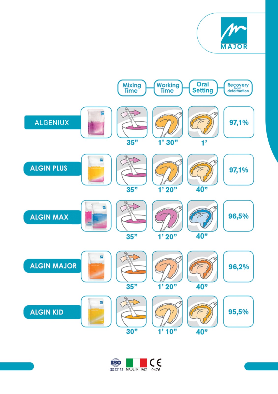 این محصول یک ماده قالبگیری عالی برای تهیه مدلها و قالبها دارای سیالیت بالا است. این ماده سازگاری عالی با انواع گچها داشته و دارای تاریخ مصرف طولانی (6 سال) است. از سایر ویژگیهای حائز اهمیت آن میتوان به ثبات حجمی عالی و مقاومت آن در برابر فشار و تغییر شکل اشاره کرد. این پودر بدون گرد بوده که قالبگیری عالی و تمیز کردن آسان را به دست میدهد. همچنین سریع و آسان با آب مخلوط شده و ترکیبی یکدست را ایجاد میکند.آلژینات کروماتیک مدل Algin Plus از برند ایتالیایی ماژور در فروشگاه اینترنتی نیک مدیکال عرضه میشود.